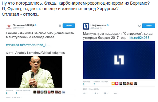 OlegRO Опубліковано: 29 жовтня 2016 Опубліковано: 29 жовтня 2016 адовый бомбёж Лео, занесенный меч над раисей)) поподробнее о провале раиси в Черногории про райкина путлер : "Украинцев и россиян сначала разделили, а потом стравили". Ну океееей.. раисю выгнали из Совета ООН по правам человека Анал звизда в своём репертуаре