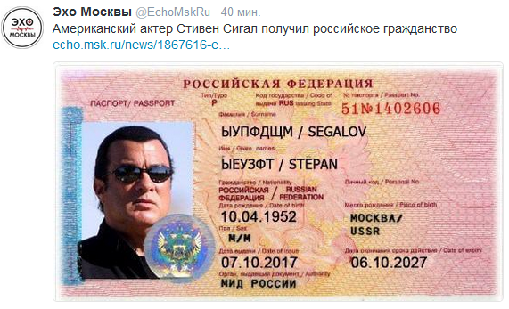 Outlawif Опубліковано: 3 листопада 2016 Опубліковано: 3 листопада 2016 у него временное помешательство Ты знаешь Дед, он ведь куда постарше тебя будет, 64 ему стукнуло. И печально говорить, но старый добрый Нико отнюдь не в добром здравии. Это заметно, если посмотреть на его интервью. Паспорт может и фейк Да 100%й, абсолютный фейк, это очевидно ) Там столько косяков, что даже не смешно. Русская "транскрипция" имени и фамилии впечатляют )) Дата выдачи в будущем году. А место рождения - Москва? )) Ну а древнее фото из фильма, да еще и в темных очках?! Сейчас у Сигала щеки в полтора раза шире и борода, а фото на паспорт делают прямо в консульстве. Но что гражданство получил это да, говорит так удобнее к друзьям ездить, у него родственники где-то во Владивостоке есть и в Питере. Кстати, украинские корни у него тоже есть, так что вполне возможно он и украинское гражданство скоро получать приедет, для коллекции ))