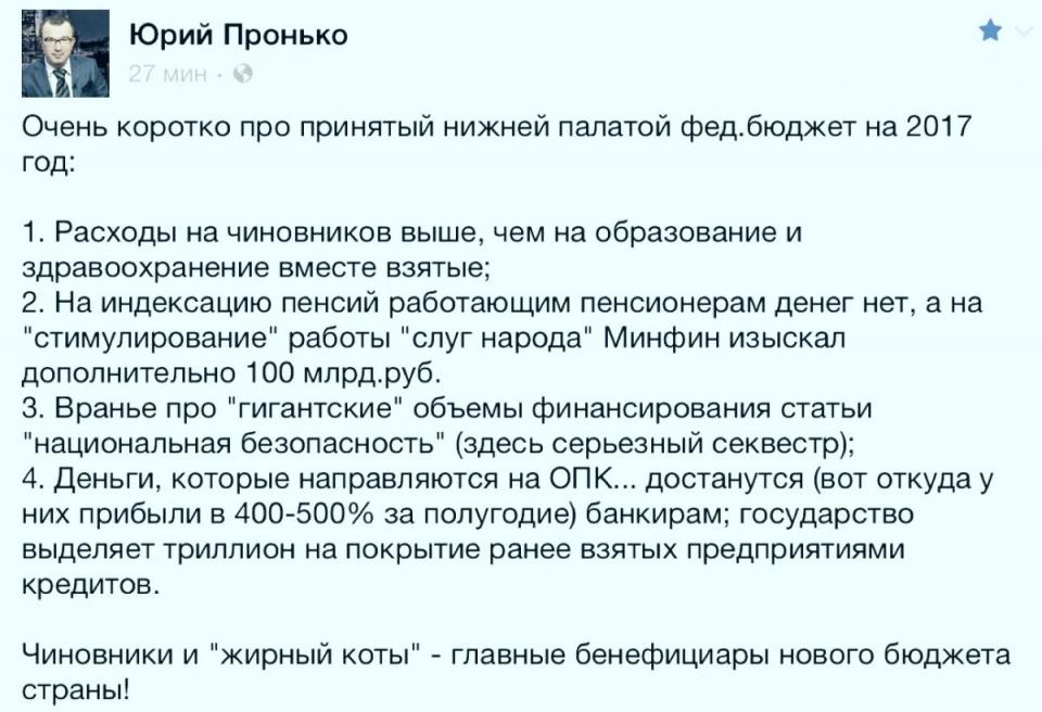 Дагот Опубліковано: 11 грудня 2016 Опубліковано: 11 грудня 2016 Москали готовят кадров для инженерных специальностей со школьной парты, на современном оборудовании. Припини !)) :pod_stolom: Российский парламент в третьем окончательном чтении принял федеральный бюджет на ближайшие три года. Уже сейчас можно утверждать, что предложенный правительством и одобренный Госдумой главный финансовый документ – это бюджет стагнации, а не развития. Более того, в следующем году будет полностью исчерпан т.н. «Резервный фонд» России.