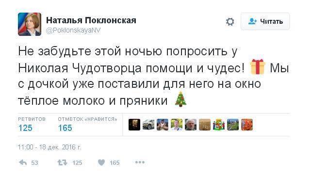 Дагот Опубліковано: 19 грудня 2016 Опубліковано: 19 грудня 2016 Постійна учасниця цієї теми Дмитрий Чекалкин Сделала в точности как рекомендовал Суворов! Всё смешалось в голове у Поклонской... Теплым молоком и пряниками задабривали Домового... и выманивали ежей))). А 24 декабря, в канун котолического Рождества, у "гейропейцев" принято оставлять для Санты, в знак благодарности, пару пирожков, рюмку портвейна и морковку для красноносого оленя Рудольфа... - Надеюсь она в курсе, что это не тот Николай, икону которого она носила. - Наталья спутала очередного Николая. Неровно дышит Наташа наша на Николаев...- "Наташа, попроси у Николая ума..." - Чудный мир, где знания не умножили печали. - Надо попросить Николая Чудотворца, чтобы таких дур с псевдо-иконами больше никуда не пускали!
