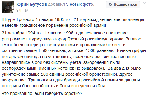 Garon Опубліковано: 2 січня 2017 Опубліковано: 2 січня 2017 Показать Российская армия входила в город четырьмя группировками – свыше 15 000 человек, 195 танков, свыше 500 БМП и БТР, свыше 200 орудий и минометов, поддержка штурмовиков и вертолетов.. Им противостояли отряды чеченского ополчения численностью до 3,5 тысяч человек, у которых на вооружении было несколько танков, бронемашин, минометы. Чеченцы ожидали атаки и подготовили эшелонированную оборону. Штурм началось с многочисленных провалов, обусловленных некомпетентным управлением и подготовкой. Передовой отряд 104-й воздушно-десантной дивизии был ошибочно атакован двумя российскими штурмовиками Су-25 - 5 БМД было уничтожено, свыше 50 солдат убито и ранено. Подразделение потеряло боеспособность. Передовой отряд 276-го мотострелкового полка не провел разведки местности, и в результате попал на минное поле - взорвалось 7 БМП. Подразделение отступило для восстановления боеспособности. На въезде в Грозный со стороны Моздока части внутренних войск МВД РФ вступили в ожесточенный бой с соседними армейскими подразделениями - с большими потерями с обеих сторон. Ключом разгрома стало решение чеченского командования бить противника по частям, по-очередно, на каждом направлении, сосредотачивая свои главные силы. На ряде направлений чеченцы дали отпор еще на окраинах. Но почти беспрепятственно в центр города вошли 131-я мотострелковая бригада, 81-й мотострелковый полк, сводный отряд 20-й мотострелковой дивизии. Эти части заняли окрестности президентского дворца и железнодорожный вокзал. На другом направлении в город углубился 693-й мотострелковый полк. Достигнув указанных рубежей российские части остановились, и более никаких активных действий не предпринимали. Вскоре они были окружены мобильными отрядами чеченцев и атакованы со всех сторон, прежде всего с помощью гранатометов и минометов, стрелкового оружия. Это было не так героически, как снял Невзоров в "Чистилище". Российские подразделения действовали беспомощно, и занимали крайне невыгодные позиции, на которых несли большие потери. Мобильные группы чеченской пехоты действовали дерзко и и парализовали сопротивление россиян, прижимавшихся к бронетехнике на вокзале и неспособных занять лучшие позиции. Затем остатки окруженных попытались вырваться из города, но прорыв не был организован, и чеченцы легко перебили большинство бойцов и почти всю технику. Комбриг 131-й бригады полковник Савин был убит. (Кстати, после разгрома 131-я бригада была выведена из боя, а затем ее передислоцировали в Абхазию и переформировали в 7-ю военную базу - это воинская часть принимала участие во вторжении в Украину в 2014-м, и также понесла потери). Командир 81-го полка полковник Александр Ярославцев был ранен, но ему удалось выжить, вот его рассказ: "К маю 1994 года полк приказали укомплектовать и назвать полком быстрого реагирования. Комплектовали, кем придется. На май 1994 года в полку было только 3 техника роты вместо девяти, 60% солдат, прослуживших по полгода в "учебке", а взводные командиры - в основном двухгодичники. В это же время два командира роты ушли в милицию - офицерам не платили денег. Попытки организовать боевую подготовку закончились плачевно - в июне начался кризис с топливом. Из-за постоянных невыплат жалованья стали уходить прапорщики-специалисты. В июле в полк н