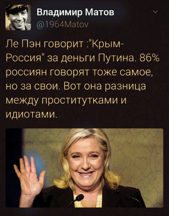 xx07xx Опубліковано: 3 січня 2017 Опубліковано: 3 січня 2017 СБУ не исключает, что Ле Пен запретят въезд в Украину кандидат в президенты Франции от ультраправой партии "Национальный фронт" Марин Ле Пен заявила, что аннексия Крыма Россией "не была нелегальной". https://ipress.ua/ru/news/sbu_ne_ysklyuchae...ynu_194223.html