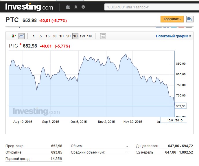 OlegRO Опубликовано 16 января, 2016 Опубликовано 16 января, 2016 а народ россии сцыкун и только кавказец возмутился, как показалось мне по акценту снимающего видео сколен: Индекс ММВБ рухнул на 4,3%, РТС - на 5,8% Сегодня основные фондовые индексы обвалились. На момент написания обзора ММВБ потерял 4,8%, до 1600,09. РТС опустился на 6,37%, до 648,85. Основная причина паники – резное падение нефтяных котировок. Brent сегодня достигла отметки в $29,65 за баррель, канадская нефть (WCS) сегодня стоит $15 за баррель. За нефтяными котировками следует и российская валюта, которая снизилась на 1,67 рубль против доллара, до 77,72 рублей и на 2,68 рубля против евро, до 85,29 рублей. В данных условиях есть вероятность того, что ЦБ РФ придется пойти на повышение ставки, чтобы не допустить серьезной паники на рынке, о чем уже заявила первый зампред Банка России Ксения Юдаева. Основание для повышения ставок будет связано с ростом рисков разгона инфляции.