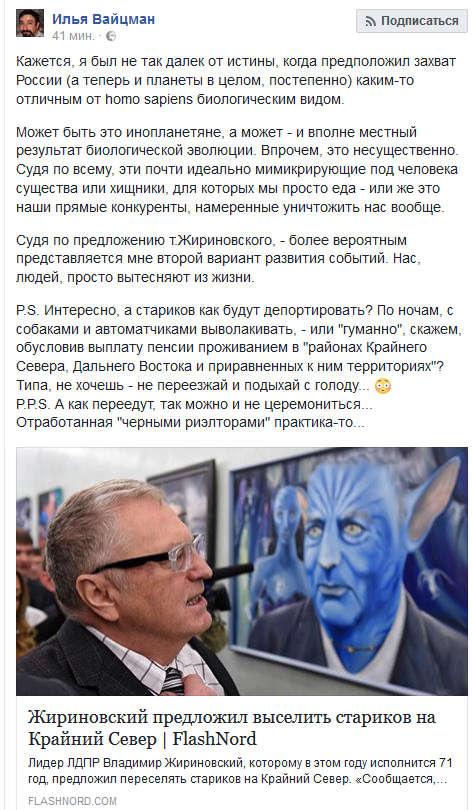 Дагот Опубліковано: 24 січня 2017 Опубліковано: 24 січня 2017 Саша Сотник Очень много постов о том, как упало качество еды. Очень много. Сетуют и даже почти возмущаются. Ребята, а что вы хотели? Всех ненавидеть, ни хрена не производить, кроме трупов от "руццкага мира", убивать соседей и сытно при этом жрать? Так не бывает. Бывает иначе. Мир отворачивается и огораживается от вас. На смену дорогим и качественным продуктам приходит гнилье, на смену качественным пищевым добавкам приходят дешевые канцерогены. Медицина загибается, онкология и СПИД процветают. Это называется даже не геноцид. Геноцид - это когда кровавый диктатор убивает население миллионами. А тут население само с пеной у рта поддерживает кучку бандитов, либо - прячется в глубокой "несознанке". Так что это - не геноцид. Это - естественный процесс самопожирания империи. Я еще об этом напишу. Подробно. Захорошеет...