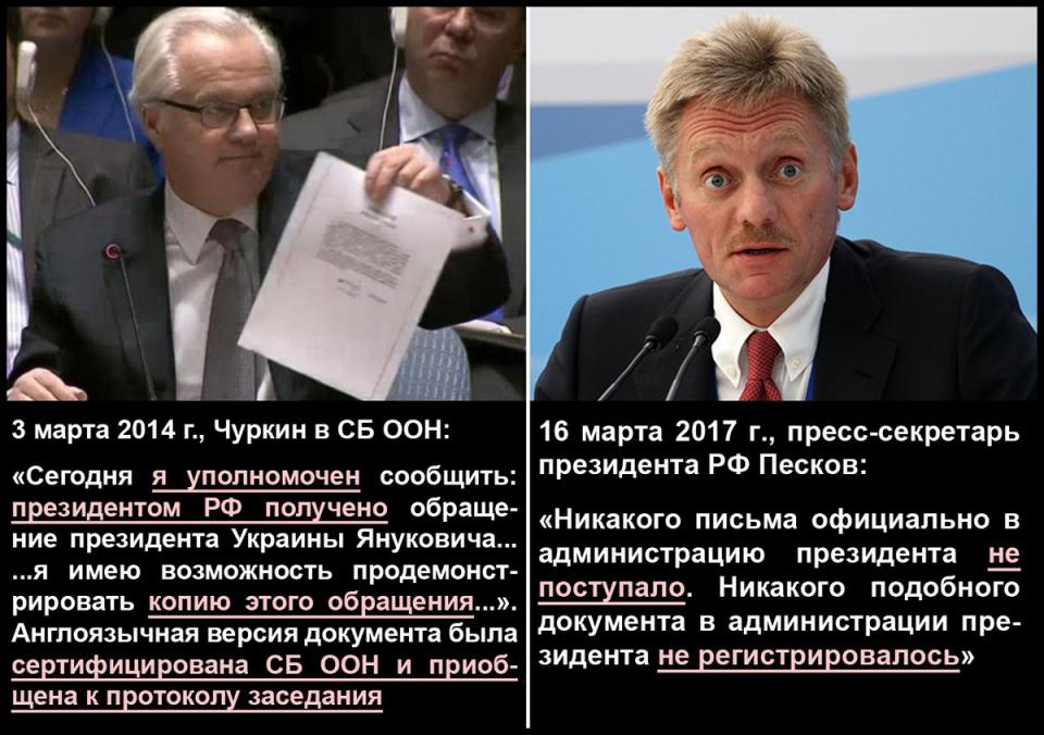 OlegRO Опубліковано: 16 березня 2017 Опубліковано: 16 березня 2017 Пресс-секретарь президента РФ Дмитрий Песков заявил, что никакого письма от экс-президента Украины Виктора Януковича в адрес президента РФ Владимира Путина в администрацию главы российского государства не поступало. "Дело в том, что никакого письма официально в администрацию президента не поступало. Никакого подобного документа в администрации президента не регистрировалось", - сказал Песков журналистам в четверг. Он не стал комментировать информацию о том, что, выступая на заседании Совета безопасности ООН, полпред РФ Виталий Чуркин говорил о наличии такого письма и о том, что он уполномочен доложить о нем. "Этого я не знаю. Я могу только констатировать ситуацию де-факто и де-юре, то есть то, что я уже сказал", - отметил пресс-секретарь. 4 марта 2014 года на заседании Совбеза ООН постоянный представитель РФ Виталий Чуркин заявил, что Янукович направил Путину письменную просьбу использовать российские вооруженные силы на Украине. "Как законно избранный президент Украины обращаюсь к президенту Путину с просьбой использовать Вооруженные силы России для восстановления законности на территории Украины", - процитировал Чуркин это письмо. По его словам, обращение к президенту РФ было датировано 1 марта 2014 года. ---------------------- Российский министр владеет виллой в Италии, стране блока НАТО. Но национал-предатель - по-прежнему ты! ---------------------- Не то беда, что Путин хочет быть царем, а то, что россияне — холопами. На проспекте Вернадского в Москве проступил лик Путина: КрымНаш! кричали "вежливые" человечики годовщина аннексии