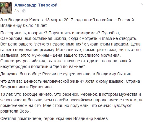 Дагот Опубліковано: 16 березня 2017 Опубліковано: 16 березня 2017 Російський блогер Олександр Тверськой на прикладі героїчно загиблого бійця АТО Володимира Князєва показав, що, коли в РФ скаржаться на Україну, яка "недостатньо розуміє" "братський народ", нехай краще подивляться в очі молодих загиблих українських захисників, їх матерів, дружин і дітей. На своїй сторінці в Facebook блогер виклав фото Князєва, якому виповнилося 18 років і який загинув на Донбасі 13 березня