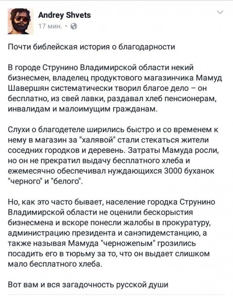 Дагот Опубліковано: 21 березня 2017 Опубліковано: 21 березня 2017 Около 200 человек в Струнино уже восемь лет не тратят на хлеб ни копейки https://www.kommersant.ru/doc/3240962 Породу не испортить.... Владелец продуктового магазинчика в городе Струнино бесплатно раздает хлеб бедным. За это "нахлебники" уже пытались жаловаться на него в прокуратуру, обзывали черномазым и обещали посадить — мало дает! "Кто выдает нам этот хлеб? Путин, кто ж еще! — суровый мужчина протягивает продавщице бумажку с печатью "Продуктовый магазин "Ерик"" и надписью "Талон на выдачу одного батона и половинки черного. Март" и получает требуемое.— Президент дал распоряжение, чтоб малоимущим, пенсионерам и инвалидам оказывали помощь. Вот и оказывают. Но эти торговцы хитрые, себя тоже не обидят! Понаехали в Россию и кормятся за наш счет!" Мужчина подозревает, что ему положен целый кирпичик "Дарницкого", а не половинка, а в магазине воруют его законную долю. "Один талон — один батон и полбуханки «черного». Десять талонов на человека на месяц. Больше нельзя. Хлеб начнут продавать и покупать водку. Проверено." "Занимают очередь с самого раннего утра. Мне это не совсем понятно, ведь знают, что никто без талонов не уйдет. Тем не менее, летом столпотворение начинается с рассвета. Пишут номер очереди на ладонях." "Но иногда приходит бабушка с талоном, а хлеб закончился. И она начинает кричать, что это президент нас обязал раздавать хлеб, районная власть, депутаты, а мы не выдаем — значит, ”по-своим растащили”. Долго кричит, уходит, а на следующий день придет пораньше и все получит. Так и продолжает считать, что это власти о ней заботятся, а она нас напугала проверками" https://takiedela.ru/2017/03/mamud-iz-strunino/