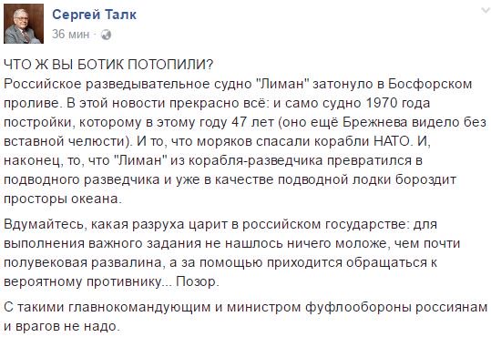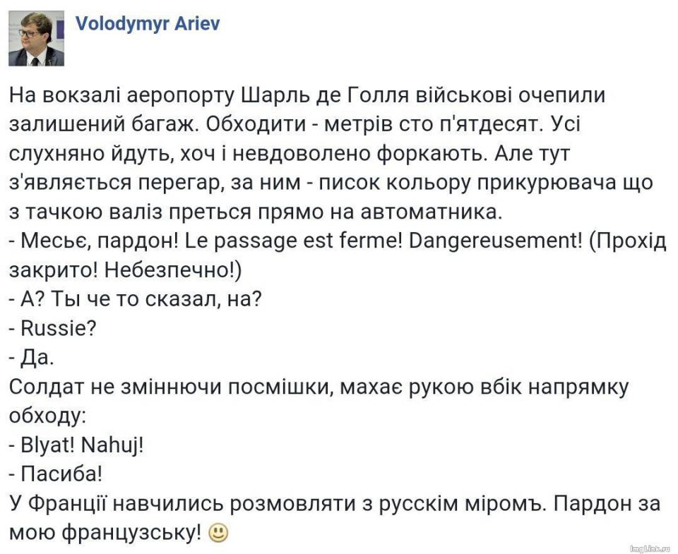 OlegRO Опубліковано: 27 квітня 2017 Опубліковано: 27 квітня 2017 Шикарная визуализация Путинской России (Маленький и Большая) https://www.youtube.com/watch?v=9zikMYGrLh4 нато Лиман? Черноморский Флот провел бомбардировку дна пролива Босфор. Уничтожено 4 штаба ИГИЛ и 100500 боевиков команда потопившего "Лиман" сухогруза представлена к наградам НАТО деньпобеды головного мозга У Первого канала кончились иностранцы, теперь роль иностранных журналистов играют мелкие мошенники из Питера: «Первый канал» выдал за американского журналиста Грэга Вайнера питерского бизнесмена Григория Винникова https://theins.ru/antifake/53655 "Согласно опросу ВЦИОМа, россияне счастливы как никогда прежде" в платежках россиян к строчкам 'на Крым, Алеппо и Чечню' добавится платеж 'за свет в ЛНР' Пенсионерка улетела вместе с лестничным пролетом в подвал многоэтажки в Бийске https://tayga.info/133973 К домам Янино течет канализационный поток https://47news.ru/articles/119823/?utm_source=novapress