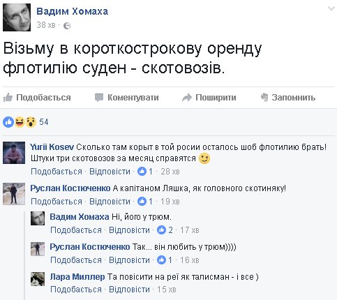 Дагот Опубліковано: 27 квітня 2017 Опубліковано: 27 квітня 2017 Владимир Матов Вот вы юморные! Все о баранах пишите. А главное-то в другом! РАЗВЕДЫВАТЕЛЬНЫЙ (!) КОРАБЛЬ ВМС РФ НЕ ОБНАРУЖИЛ В ТУМАНЕ БАРЖУ С ОВЦАМИ! Аут.