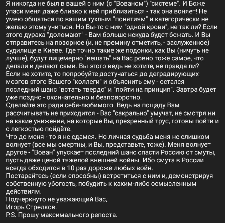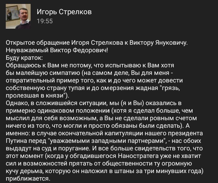 extremal Опубліковано: 30 квітня 2017 Опубліковано: 30 квітня 2017 Гіркін не одноразово заохочував до великоі війни з Украіною. Захоплення Києва й зміна верхівки. Одна проблема вирішена. Наступний крок відміна санкцій. І іх знімуть швидко, адже самі украінці в обличчі нового уряду будуть про це просити.