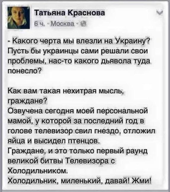 extremal Опубликовано 24 января, 2016 Опубликовано 24 января, 2016 Россияне до оккупации Россией Крыма свободно ездили туда на отдых, наслаждаясь украинской дешевизной. Не было у них никаких проблем ни с турпоездками за границу, ни с курсом рубля. После оккупации Россией Крыма: - Крым в блокаде: транспортной, водяной, энергетической, экономической; - на шею России сели 550 тысяч пенсионеров; - Россию обложили санкциями; - Россия исключена из «большой восьмерки», членства в которой долго и упорно добивалась; - рубль упал вдвое; - Южный поток - убыток 5 миллиардов зеленых; - Украина из союзника стала злейшим врагом; - тысячи убитых россиян и украинцев; - реальные доходы и покупательная способность россиян падают; - потери России от санкций превысили 160 миллиардов долларов; - туроператоры, банки, авиакомпании терпят невосполнимые убытки; - бегство капитала из России измеряется сотнями миллиардов долларов в год; - Европа отказывается от российского газа - вовсю занимается диверсификацией поставок; - крупнейший покупатель газа - Украина - снизила закупки до минимума; - цены на продовольствие и все остальное в России резко растут; - санкции лишили Россию доступа к западным технологиям, что влечет за собой проблемы в газовой и нефтяной промышленности, здравоохранении и других отраслях; - оборот розничной торговли сокращается; - инвестиции и промышленное производство падают; - испорчены отношения с ЕС и НАТО; - начались аресты российских активов за рубежом; - впереди трибунал по МН17... А теперь еще Путин втянул Россию в войну в Сирии... Спрашивается: Зачем это все было нужно России?