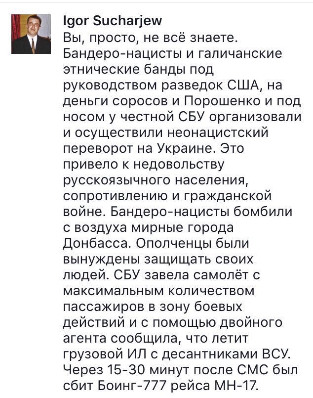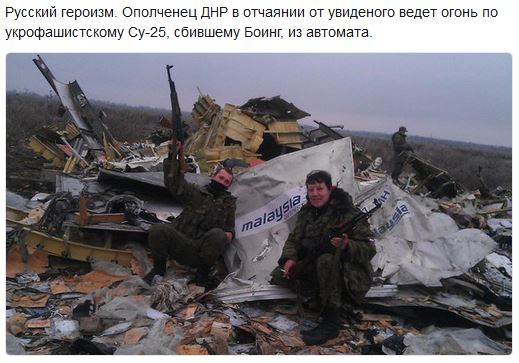 Дагот Опубліковано: 17 липня 2017 Опубліковано: 17 липня 2017 Александр Тверской Только что · Если когда-нибудь кто-нибудь спросит меня: "А что такое русский мир, расскажи наглядно". Я не буду ничего говорить и копаться в фотографиях гулаговского прошлого. Покажу спрашивающему одну-единственную фотографию. Из последнего. Вот, скажу, это россияне фотографируются с обломками только что сбитого ими гражданского самолета.