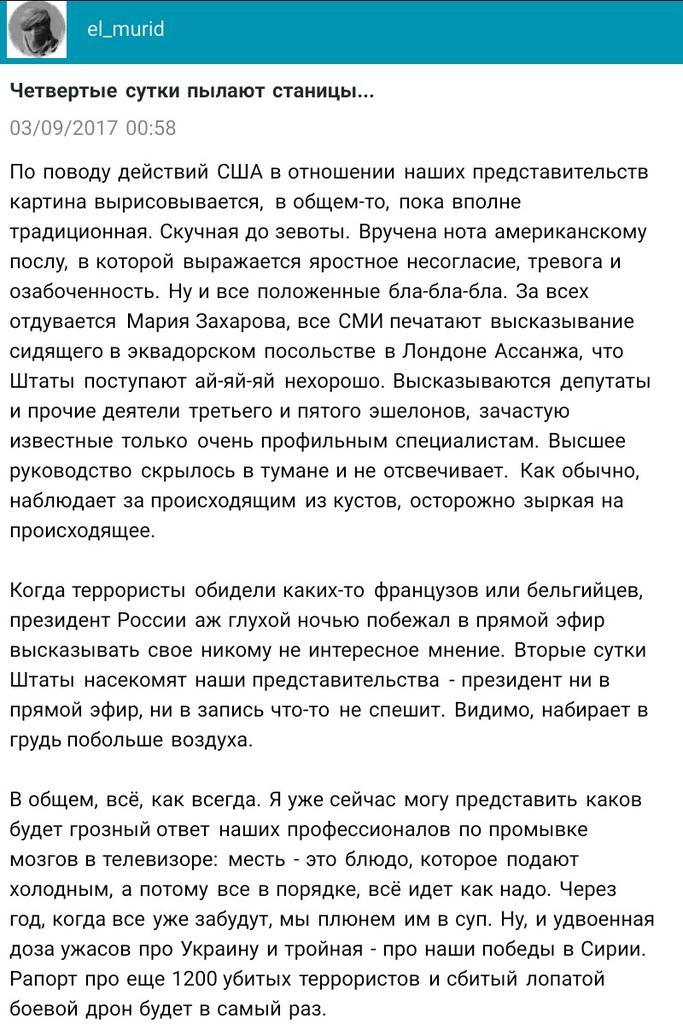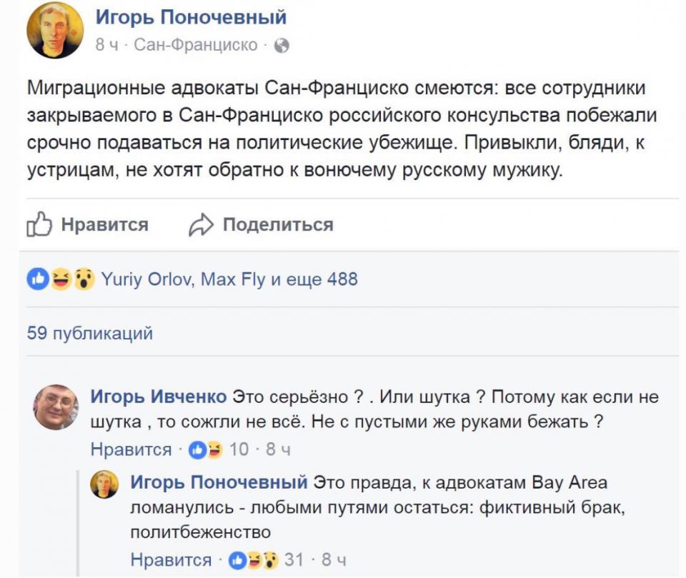Дагот Опубліковано: 3 вересня 2017 Опубліковано: 3 вересня 2017 по поводу шмона -рашка в бешенстве https://hvylya.net/news/digest/rossiya-v-be...ashingtone.html Некоторые сотрудники российского Генконсульства в Сан-Франциско намерены просить политического убежища в США и обратились в связи с этим в юридическую фирму American Corporate Services. Об этом в интервью калифорнийскому блогеру Игорю Поночевному сообщил глава фирмы Григорий Филькенсон. "У меня есть хорошая новость для работников бывшего консульства в Сан-Франциско - они могут стать политическими беженцами. ... К нам уже прибежало несколько человек (не желающих возвращаться в РФ - прим.)", – сказал Финкельсон. Он уточнил, что не все сотрудники российского диппредставительства, желающие остаться в США, смогут получить убежище. "Вы должны быть квалифицированы на политическое убежище. Мы вам поможем правильно оформить вашу историю. ... Каждый случай нужно конкретно разбирать. Мы уже получили несколько звонков от работников консульства, и мы уже с ними начинаем работать", - пояснил юрист. Блогер Иван Филиппов подтвердил информацию, сославшись на свои источники в адвокатских кругах.