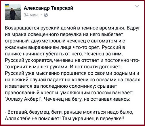 Дагот Опубліковано: 7 вересня 2017 Опубліковано: 7 вересня 2017 Радиостанция «Эхо Москвы» организовала на своем сайте откровенно “нацистский” опрос под названием «Встретить представителя какой национальности в темное время дня вы опасаетесь?». По состоянию на 7:30 мск, в опросе приняли участие 8768 человек. 5047 из них (58 процентов опрошенных) признались, что опасаются встретить украинцев. Еще 2703 (или 31 процент) опасаются встречи с чеченцами. 12 процентов (или 1018 опрошенных) затруднились ответить. Кроме чеченцев и украинцев, другие нации в опросе представлены не были. https://youtu.be/J9pRLZ4Aayw