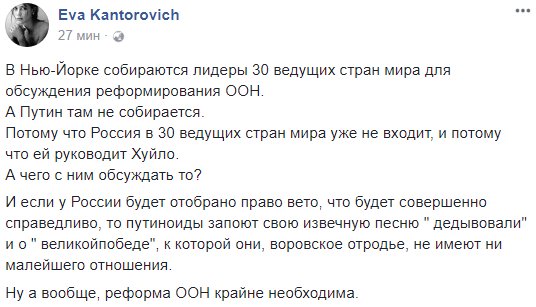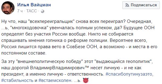 Axwell Опубліковано: 9 вересня 2017 Опубліковано: 9 вересня 2017 (змінено) Cначала пишет об отсутствии участия России "вообще", и тут же ссылается на ТАСС. Зачем тогда зовут говорящую лошадь ? Сидел бы в Москве и от туда возмущался. https://tass.ru/vef-2017/articles/4540480 Согласно предварительному плану форума, 21 сентября состоится выступление главы МИД РФ Сергея Лаврова, который будет представлять Россию на сессии. Змінено 9 вересня 2017 користувачем Axwell