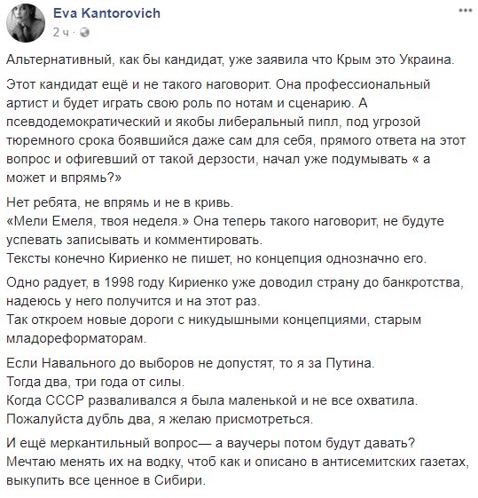 andreyyy Опубліковано: 22 жовтня 2017 Опубліковано: 22 жовтня 2017 Навальный что-то там сказал такое нехорошее про Украину (я не знаю что - не слышал, слышал только как его за это ругают), поэтому резко стал агентом Кремля. Обычная история же. Я конкретно тоже не понял, что антиукраинское вменяется кроме рвения вернуть Крым как Касьянов. Но с "первым делом вернем Крым" в предвыборной программе любой политик обречен на низкий рейтинг в нынешних реалиях России. А так "уберемся с Востока", сядем за стол переговоров, пересажаем наших военных преступников и коррупционеров - уже дофига по сравнению с реалиями очередного выбора Путина