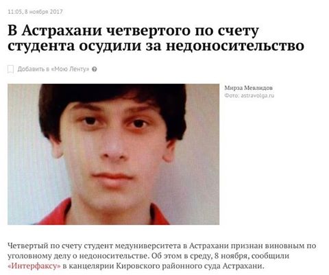 Дагот Опубліковано: 8 листопада 2017 Опубліковано: 8 листопада 2017 Недоносок)) Четвертый по счету студент медуниверситета в Астрахани признан виновным по уголовному делу о недоносительстве. Об этом в среду, 8 ноября, сообщили«Интерфаксу» в канцелярии Кировского районного суда Астрахани. Уроженца Дагестана Мирзу Мевлидова приговорили к штрафу в 80 тысяч рублей за то, что он скрывал свое общение с бывшим сокурсником, который воевал в рядах террористической организации «Исламское государство» (ИГ, запрещена в России). Как изменится жизнь россиян после вступления в силу поправок Яровой Как отметил представитель суда, боевик рассказывал Мевлидову и еще троим студентам «о своей жизни в Сирии, делился фотографиями, предлагал поучаствовать». Подсудимый признал свою вину и просил суд о снисхождении. В сентябре к выплате штрафов на ту же сумму приговорили остальных фигурантов дела. Они также сознались в содеянном. Статья 205.6 УК РФ, предусматривающая ответственность за несообщение о преступлении, входит в число антитеррористических поправок, внесенных в законодательство летом 2016 года и известных как «пакет Яровой». Первый приговор за недоносительство в стране вынесли также в Астрахани в феврале 2017 года. Фигурант этого дела Улугбек Гафуров, чей знакомый стал боевиком, был оштрафован на 70 тысяч рублей.