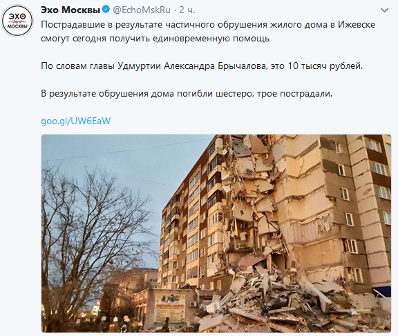 Jus Опубліковано: 10 листопада 2017 Опубліковано: 10 листопада 2017 Показать все же там на самом деле немного совсем не так: "Глава Удмуртии Александр Бречалов сообщил, что семьи погибших при обрушении дома в Ижевске получат по 1 млн руб. «Что касается погибших, членам семьи (это в законе прописано, супруг, супруга, дети на иждивении) — 1 млн руб. за каждого погибшего. Вред здоровью легкий — 200 000, тяжелый — 400 000. По имуществу — от 500 до 200 000 руб.», — сказал Бречалов. Все остальные жители этого дома получат по 10 000 руб." https://www.vedomosti.ru/politics/news/2017...emyam-pogibshih