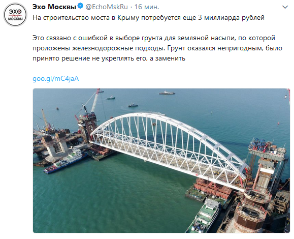 Cardopusher Опубліковано: 23 грудня 2017 Опубліковано: 23 грудня 2017 Три миллиарда на мост? Тьфу, это всего лишь удорожание его всего на полтора процента. Блин) А начиналось все с 25млрд рублей) Сейчас около 300млр. Нормальное удорожание ">