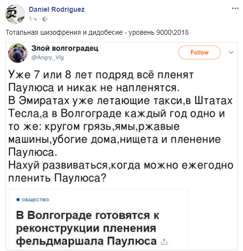 Дагот Опубліковано: 2 лютого 2018 Опубліковано: 2 лютого 2018 Денис Казанский 6 мин. · В России критикуют декоммунизацию, ругают украинцев за русофобию, а сами потихоньку проводят деукраинизацию. Венедиктов пишет, что в московском метро на станции Киевская у девушки на фреске на всякий случай закрасили венок на голове и нарисовали сверху косынку. Мало ли что. А то сегодня ты веночек носишь, а завтра вступишь в Правый сектор.