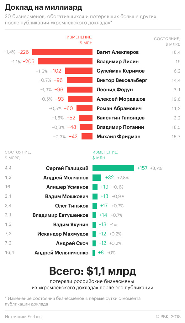 Дагот Опубліковано: 31 січня 2018 Опубліковано: 31 січня 2018 Активы российских миллиардеров, попавших в «кремлевский список» США, за день подешевели на $1,1 млрд, показывают расчеты российского издания РБК.