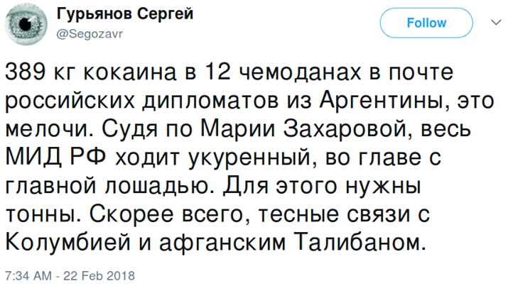Дагот Опубліковано: 23 лютого 2018 Опубліковано: 23 лютого 2018 400кг кокаина в российском посольстве. Тыц — Русофобы чёртовы!, - заявили в МИДе РФ.