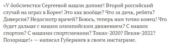extremal Опубліковано: 24 лютого 2018 Опубліковано: 24 лютого 2018 https://echo.msk.ru/news/2154092-echo.html В Архангельской области сегодня стартуют соревнования для отстранённых от Олимпиады спортсменов Российские власти представляли это первенство как альтернативу международным играм в Пхёнчхане, победителей обещали премировать на олимпийском уровне. Тех, кого не пустили на Олимпиаду, собирают сегодня в деревне Кононовская Архангельской области. Здесь целую неделю будут проходить лыжные гонки. Участвовать в соревнованиях пригласили сильнейших российских спортсменов, в то же время в Министерстве спорта заявляют, что это первенство — открытое. А ещё оно будет проходить в разных регионах. Бобслеистов ждут в Сочи с 20 по 26 марта, параллельно в подмосковной Коломне будут соревноваться конькобежцы. Затем — в конце марта-начале апреля — в Ханты-Мансийске пройдёт биатлонный этап, а в Петербурге соревнования по шорт-треку. Обладателям первых мест обещают денежные вознаграждения — до 4 миллионов рублей. Это соответствует, а в некоторых случаях превышает размеры премий, которые присуждают за победу на настоящих Олимпийских соревнованиях. Осенью 2016 г. в аналогичном формате Россия провела Открытые соревнования по видам спорта из программы Паралимпийских летних игр. В состязаниях приняли участие более 250 спортсменов, которые завоевали квоты на поездку на Паралимпиаду, но не были допущены из-за допингового скандала.