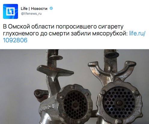 Дагот Опубліковано: 27 лютого 2018 Опубліковано: 27 лютого 2018 Конфликт произошёл из-за того, что выпившему соседу жест показался оскорбительным. В Омской области глухонемого избили до смерти за неправильно истолкованный жест. Как говорится на сайте управления Следственного комитета РФ по региону, мужчина скончался в больнице от полученных травм. — 24 февраля 2018 года на улице между глухонемым потерпевшим и его соседом произошла ссора из-за того, что глухонемой жестом попросил закурить, но выпившему соседу показалось, что жест носил оскорбительный характер, — говорится в сообщении. Отмечается, что сосед пришёл от этого в бешенство и набросился на обидчика с кулаками. В результате драку увидела сожительница оскорблённого мужчины и решила за него заступиться. 39-летняя женщина несколько раз ударила инвалида по голове мясорубкой. Глухонемого с черепно-мозговой травмой доставили в больницу, однако врачи не смогли его спасти. Подозреваемую задержали. Расследование продолжается.