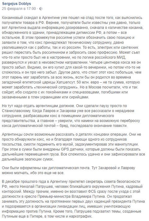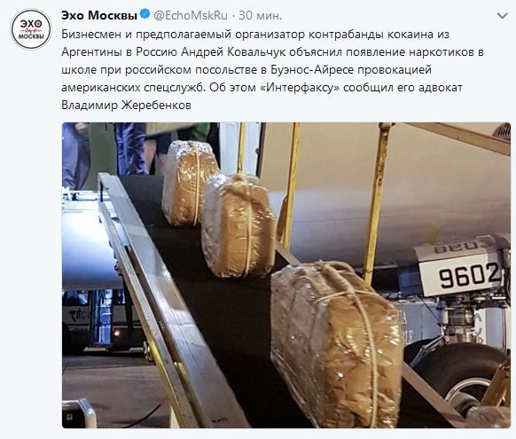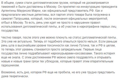 Дагот Опубліковано: 28 лютого 2018 Опубліковано: 28 лютого 2018 Жандармерия Аргентины: Россия врет, именно президентский самолет забирал кокаин. Выяснилось, что «отличившийся» Лайнер принадлежит Специальному летному отряду России, подчиняющемуся непосредственно Управлению делами президента РФ. «Кокаиновый» скандал в Аргентине набирает обороты. Аргентинские правоохранительные органы посрамили российскую сторону, уверявшую, что фото, на которых виден номер президентского самолета, куда грузят кокаин, якобы фейковые. В Буэнос-Айресе подтвердили подлинность фотоматериалов — наркотик перевозил именно путинский аваилайнер, передает УКРОП со ссылкой на «Диалог.UA«. Жандармерия Аргентины также разместила новые снимки из уголовного дела о пресечении канала поставок наркотиков из своей страны в Россию. Стоит отметить, что после первой публикации аргентинской стороной фото российского президентского самолета у Путина заявили, что они поддельные. Так, управделами президента России Елена Крылова категорически отрицала участие лайнера в «кокаиновом деле». А одиозная российская дипломатка Мария Захарова и вовсе разродилась «километровым» постом у себя на странице, уверяя, что российская сторона не только не вляпалась в скандал с наркотиками, но и якобы приняла участие в разоблачении преступников. Но в жандармерии Аргентины настаивают на подлинности фотоснимков, подчеркивая, что «опубликованный фотоматериал является официальным, и он присутствует в материалах следствия». Напомним, в Аргентине задержали российский самолет с 400 кг кокаина на борту. Авиасудно перевозило российских дипломатов. Аргентинские силовики опубликовали в Twitter фото лайнера, в который загружали чемоданы, где должны были находиться 400 кг кокаина. Бортовой номер самолета — 96023 принадлежит ФГБУ Специальный летный отряд (СЛО) Россия Управления делами президента РФ, который специализируется на перевозке первых лиц государства. https://укроп.org/жандармерия-аргентины-россия-врет-им/