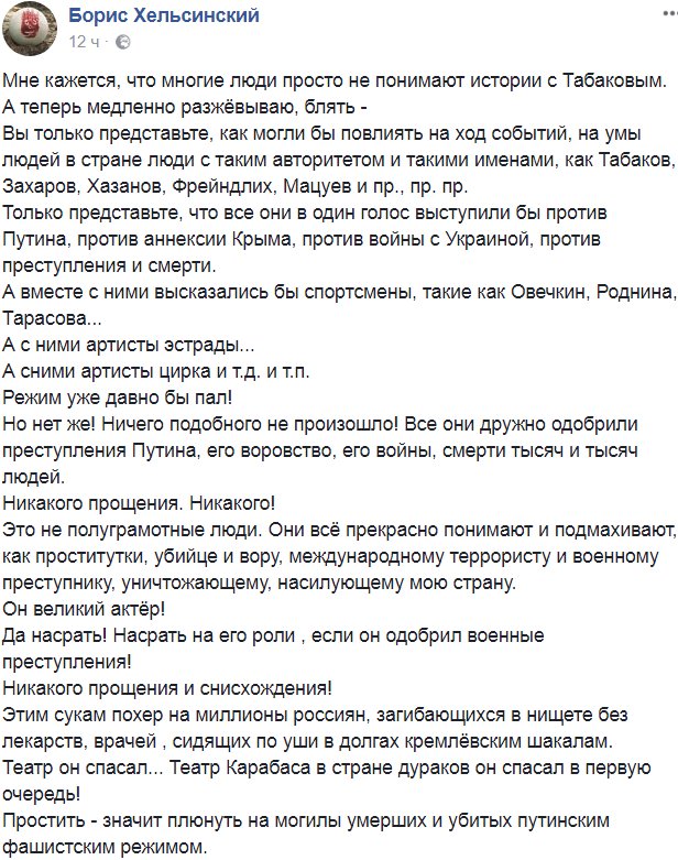 Outlawif Опубліковано: 14 березня 2018 Опубліковано: 14 березня 2018 Сколько пафоса, а смысла ноль. Авторитет Табакова мешает автору его ненавидеть? Нет. Так чем бы этот авторитет помог, выскажись он обратным образом? Его просто ненавидели бы не одни миллионы людей, а другие миллионы. Причем более опасные. Все, больше никакого эффекта бы не было. Вы сильно прониклись словами Табакова, только потому что он известный актер? Нет. Наоборот, его известность только возмущения добавила. Почему обратное не должно быть верным? Если бы да кабы. Вот если бы кто-то да что-то сделал бы. За чужую шкуру легко рассуждать. Про Табакова - я, кстати, вообще навскидку не вспомню его ролей, мое поколение уже не "то". Для меня он какой-то хрен из прошлого, в трех мушкетерах играл Людовика, больше и не вспомню. Эта шавота что лает, я уверен сама имеет скелетов в шкафу и похлеще, а здесь просто желание пропиариться на громком имени. "Щас я всем покажу, какой я принципиальный и заебатый парень! И на слона полаю.". Ну полай, полай...