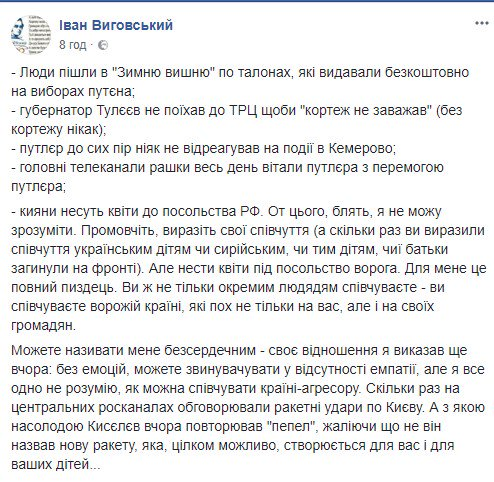 Outlawif Опубліковано: 27 березня 2018 Опубліковано: 27 березня 2018 Показать Нияких "але", тварина є тварина. Это событие никак к политике не относится, никак не относится к войне, это в любой стране могло случиться. Никто даже не думает про политику, когда несет цветы. И нужно быть конченым зомби, чтобы вспоминать про страну-агрессора по случаю и без. Люди выказывают свои соболезнования чем могут. И если когда-то наступит мир, а я надеюсь он наступит, то это случиться только благодаря тем людям, которые несут цветы и не думают про "политический контекст" этого действа, а просто хотят выразить свои переживания. А благодаря таким Выговским, всегда будет только бесконечная конфронтация и эскалация. Я тоже просто выражу свое отношение, не более того: я не хочу, чтобы в моей стране жили такие люди, как он. Я хочу, чтобы было больше тех, кто несет цветы.какое же мерзейшее ебло, а? Не могу не согласиться.