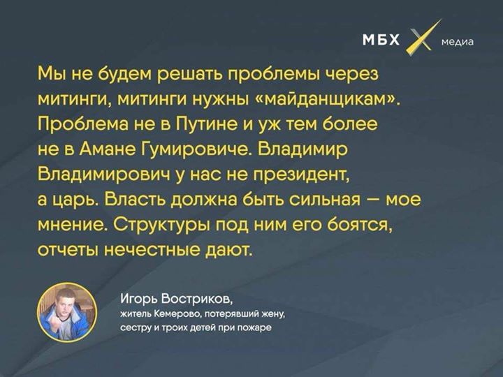 Scythe Опубліковано: 30 березня 2018 Опубліковано: 30 березня 2018 Тоже так думаю. На митинге он совсем другим был. А тут говорит вяло и запинается, как под транками. Вообще там спецы действительно к любому подход найдут. Завтра он путину спасибо начнет говорить... ЗЫ А может он изначально ряженый? Я бы на митинг точно не вышел, или повесился бы или пьяный бы лежал в беспамятстве, а он митинги собирает. А может это вообще все изначально подстава? Какой же все-таки это пиздец в стране, а... как Котик сказал - врут нарочно со всех сторон пока не начнешь чувствовать себя идиотом и не будешь знать кому верить. Не желал бы я там оказаться. Тю, ну вы тут все как дети малые. Сначала у чела была вполне понятная реакция адекватного человека - потребовать отмщения, шо вылилось в стояние на митинге. Ну шоковое состояние и всё такое... Потом как попустило - включился россиянин, ну мож ещё и помогли ему слегка соответствующе обученные люди. Перспектива №1 - прослыть бунтарём, *майдановцем*, да ещё и (а почему бы собсна и нет) пообещали навесить поджог в том самой хромой вишне. Ну не хватает виноватых, не тулеева ж обвинять... Перспектива №2 - поплакаться на ТВ, поблагодарить царя (ему, кста, уже давно ЛевелАп нужен - не царь а бог, патриарх если шо с иисусом добазарится), и, главное, получить страховку за 4 куска подгорелой биомассы (уже ж не оживить, хуле, бог\царь дал - бог\царь взял, ну и за мученичество в рай автоматически определил). И стать вполне себе обеспеченным завидным женихом, ну и если шо можно в депутаты попозже побаллотироваться - типа, кандидат от народа, ну и уже известность какая-никакая есть. А дети - ну так следующая жена ещё нарожает, делов-то.