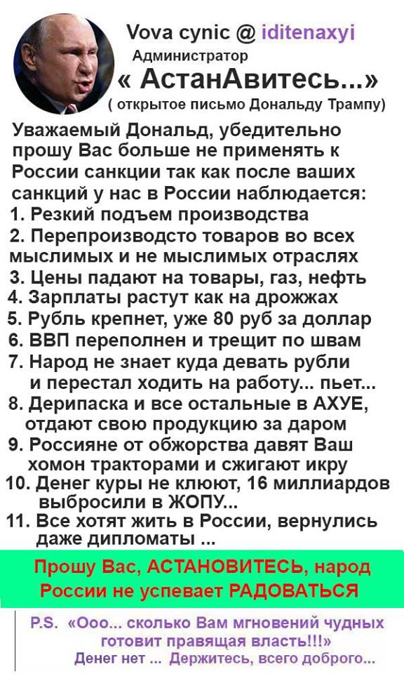 Главмех Опубліковано: 10 квітня 2018 Опубліковано: 10 квітня 2018 А вот прилетели последствия санкций и мне. Раболи мы работали, оказывается наши казахские братия заказывали конструкцию которую я проектировал не себе, а с перепродажей на Россию в один из комбинатов группы Русал… готовность 70% (как выяснилось росиянцы думают что все делают казахи) На вопрос когда будет з.п. отвечают - будет скоро но папизже