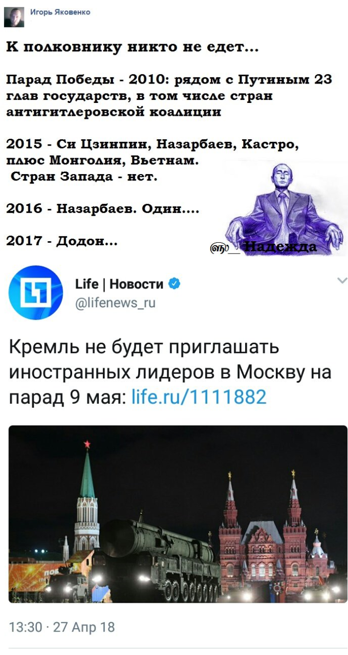Дагот Опубліковано: 30 квітня 2018 Опубліковано: 30 квітня 2018 Вы будете смеяться, но в РФ опять "брали Берлин"— на этот раз в Волгограде. Хорошо, что декорации не нужны, все разбомблено, как и 73 года назад. @vitauskas Паулюсу приготовиться.