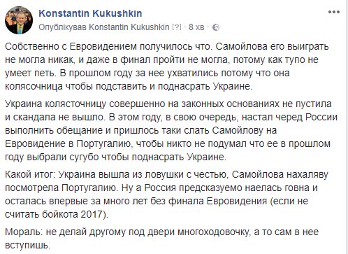 Дагот Опубліковано: 11 травня 2018 Опубліковано: 11 травня 2018 Мужики, вы смотрите Евровидение ? ) Боже упаси ! Новостная лента на глаза попадается и все.