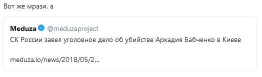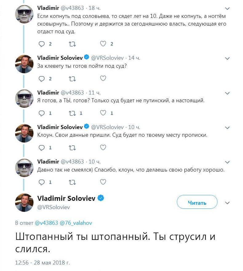 Дагот Опубліковано: 29 травня 2018 Опубліковано: 29 травня 2018 Мысли Перзидента @VVP2_0 41 мин.41 минуту назад @VVP2_0 В первом же независимом суде путинский обоссанный клоун @VRSoloviev будет признан виновным за разжигание ненависти, ложь и обслуживание преступного режима, узурпировавшего власть. Думаю, стоит копнуть и его нажитое незаконным путём богатство и недвижимость. Мысли Перзидента @VVP2_0 если уж Абрамович проиграл швейцарской газете суд, то ты обоссанный путинский клоун и подавно проиграешь. Просто суд должен быть не путинский. 22:57 - 28 мая 2018 г.