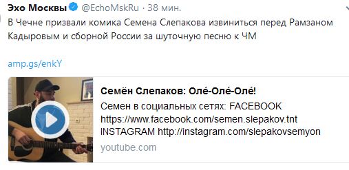 Каммерер Опубліковано: 13 червня 2018 Опубліковано: 13 червня 2018 да. в топе висит Стихотворный ответ Кадырова: В качестве постскриптума Кадыров написал стихотворение для Слепакова «в его стиле». ПоказатьИ вроде как в глаз твое обращение Не тронута бровь, прости, в сокращенье Тебе отвечает на юмор Рамзан Про Дзюбу, Египет и пармезан. И слово мое тверже камня — не сыра, За слово отвечу — ведь я, брат, Кадыров. А брат называю — ты же с Кавказа, Должен понять меня, видимо, сразу.