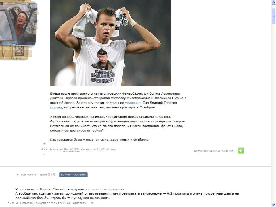 Axwell Опубликовано 18 февраля, 2016 Опубликовано 18 февраля, 2016 Показать каменты тут https://politota.dirty.ru/futbol-i-politika-1006397/ . "Локомотив" оштрафовал Тарасова на 300 тыс евро за футболку с Путиным http://112.ua/sport/futbol-lokomotiv-oshtr...nym-292969.html "В "Локомотиве" настолько сильно разочарованы ситуацией в Стамбуле, что пошли на крайние меры и применили практически рекордные санкции в истории клуба. Из зарплаты Тарасова будет удержано 300 тыс. евро и все бонусы, которые футболист мог получить за февраль. Помимо этого, клуб рассматривает вариант вычета из зарплаты Тарасова суммы штрафа, если таковой последует от УЕФА по результатам расследования", — заявил собеседник агентства. В среду УЕФА открыл дисциплинарное дело в отношении "Локомотива", решение по которому будет вынесено 17 марта. В тот же день московский клуб заявил, что считает недопустимым поступок Тарасова, который получит дисциплинарное взыскание согласно личному контракту.
