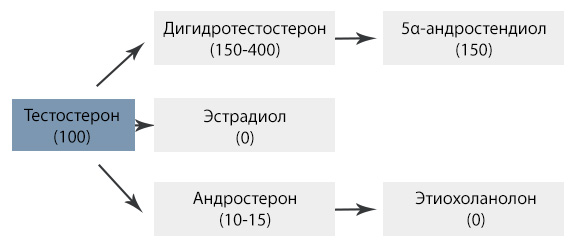Kryo Опубликовано 13 июня, 2016 Автор Опубликовано 13 июня, 2016 Метаболизм тестостерона в организме Основная часть тестостерона (около 57%), поступающая в кровь, связывается с транспортным белком – глобулин, связывающий половые стероиды (ГСПС). Поскольку связь тестостерона с ГСПС очень сильная, что мешает его проникновению в андроген-чувствительные клетки и поэтому он не обладает биологической активностью.Остальная часть тестостерона (около 43%), является биологически доступной формой андрогена. Биологически доступный тестостерон подразделяется на два вида: Тестостерон, связанный с альбумином (примерно 40%); Свободный тестостерон (примерно 3%). Биодоступный тестостерон = Т, связанный с альбумином + Т свободный. Показать Связь тестостерона и альбумина намного слабее, чем связь с ГСПС, поэтому данная связь может легко разрушаться, в связи с чем, тестостерон, связанный с альбумином, считают биологически активным.Максимальной биологической активностью обладает свободный тестостерон. Именно данная форма тестостерона, вместе с тестостероном, связанным с альбумином, оказывает биологическое воздействие на организм мужчины.Выделяют три основных пути метаболизма (превращения) тестостерона в организме: Усиление биологической активности – превращение тестостерона в более активный метаболит. Под действием 5α-редуктазы в органах репродуктивной системы (предстательная железа, придаток яичка, семенные пузырьки, кожа) тестостерон превращается в наиболее активную свою фракцию – дигидротестостерон. По своей андрогенной активности дигидротестостерон в 2,5 раза превосходит тестостерон. Изменение биологической активности – превращение тестостерона под действием ароматазы в эстрадиол – наиболее биологически активный женский половой гормон (эстроген). Данное превращение происходит преимущественно в молочной железе, жировой ткани, головном мозге, мышечной ткани. Поскольку эстрогены являются женскими половыми гормонами, они необходимы мужскому организму лишь в нормальном (не патологическом) кол-ве. Повышенное же кол-во эстрогенов у мужчины, может провоцировать феминизацию (см. подробнее о роли эстрогенов в организме мужчины). Ослабление биологической активности – превращение тестостерона в менее активные фракции. Под действием 5β-редуктазы происходит превращение тестостерона в андростерон (в сравнении с тестостероном обладает 68% от его первоначальной андрогенной активности) и этиохоланолон (не обладает андрогенной активностью). Метаболическим превращениям подвергается только биологически доступная форма тестостерона, т.е. свободный и связанный с альбумином тестостерон. Через мочеполовую выделительную систему выводятся вместе с мочой в виде андростерона и этиохоланолона около половины продуцируемого тестостерона. Рис. 1 — Изменение активности тестостерона в результате метаболических превращений (в скобках указана андрогенная активность каждого из стероидов; активность тестостерона принята за 100). Метаболизм тестостерона во многом зависит от функции печени, т.к. основные метаболические превращения происходят в клетках печени (гепатоцитах), составляющих основную часть ее массы (60-80%).В большинстве тканей, имеющих рецепторы андрогенов, тестостерон под действием 5α-редуктазы превращается в наиболее активный андроген – дигидрот