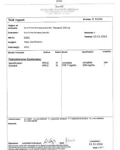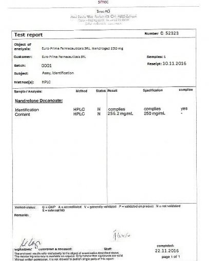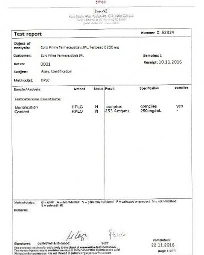 EPF Опубликовано 25 ноября, 2016 Опубликовано 25 ноября, 2016 Анализ препаратов EPF Швейцарской лабораторией SIMEC AG. Образцы на анализ были высланы без этикеток, в пронумерованном порядке 1.2.3. Предоставлены Американским магазином, расходы на анализ взяла компания Euro Prime Farmaceuticals SRL. После получения образцов, на емэйл Simec AG были высланы наименования Результаты проверок: Хроматография: образец содержит НАНДРОЛОН ДЕКАНОАТ; Результат проверки 256. 2 мг. мл. Результаты проверок: Хроматография: образец содержит ТЕСТОСТЕРОН ЭНАНТАТ; Результат проверки 253.4 мг. мл. Результаты проверок: Хроматография: образец содержит ТЕСТОСТЕРОН ЦИПИОНАТ; Результат проверки 198.7 мг. мл.