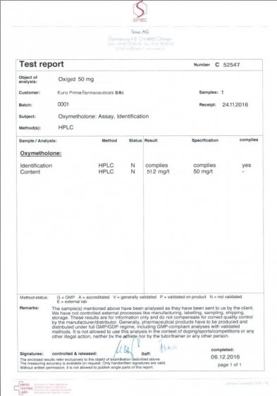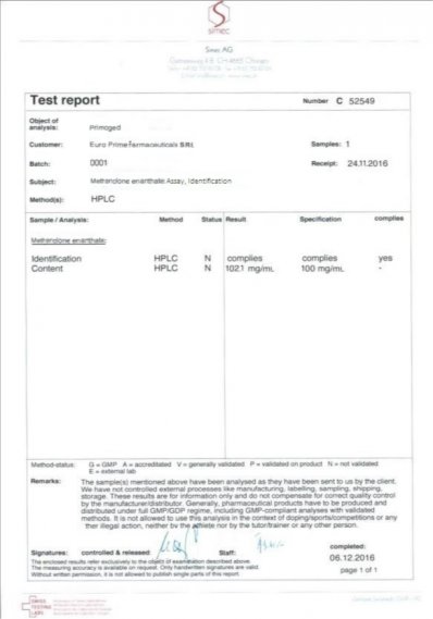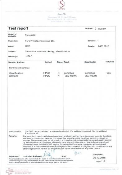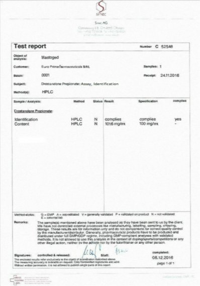 EPF Опубликовано 7 декабря, 2016 Опубликовано 7 декабря, 2016 Результаты проверок: PRIMOGED Хроматография: образец содержит: ПРИМОБОЛАН (methenolone enanthate) ; содержание ДВ в образце: 102.1 mg/ml. Результаты проверок: OXIGED Хроматография: образец содержит: Oxymetholone ( оксиметoлон ) ; содержание ДВ в образце: 51.2 mg/tab. Результаты проверок: MASTOGED Хроматография: образец содержит: drostanolone propionate ( мастерон ) ; содержание ДВ в образце:101.6 mg/ml . Посторонние примеси: НЕ ОБНАРУЖЕНЫ Результаты проверок: TRENOGED E Хроматография: образец содержит: Trenbolone enanthate (тренболон энантат ); содержание ДВ в образце: 205 mg/ml . Посторонние примеси: НЕ ОБНАРУЖЕНЫ