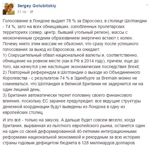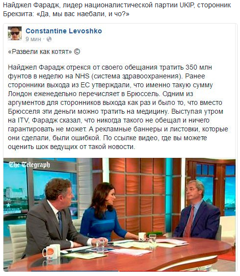 Тарас Ф. Опубликовано 24 июня, 2016 Опубликовано 24 июня, 2016 Великобританія на референдумі прийняля рішення про вихід з ЄС. Камерон подав у відставку. Шотландія і Північна Ірландія проголосували проти виходу з ЄС і хочуть повторного референдуму. Націоналісти з Північної Ірландії заговорили про референдум про вихід з Великобританії і приєднання до Ірландії. Шотландці, думаю, також над цим задумаються. Росія в захваті від британського референдуму. Деякі країни ЄС також заговорили про проведення референдумів. Хто наступний?.