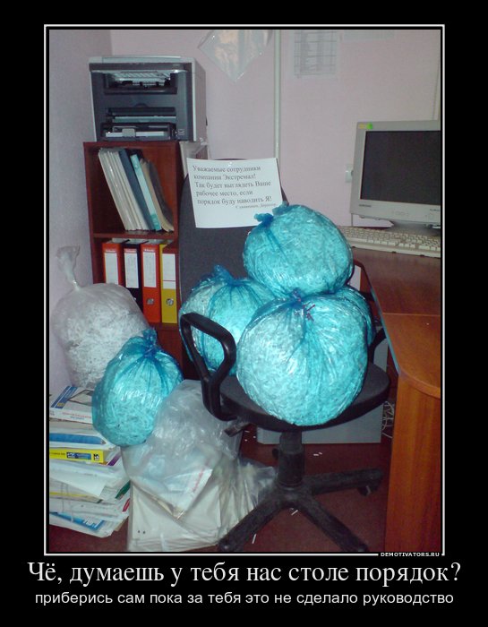 Bund Опубликовано 20 декабря, 2011 Опубликовано 20 декабря, 2011 Не торопись, будешь директором, посмотришь что будешь делать со своим имуществом, как ты его будешь любить и лелеять. Не вижу ничего зазорного в физической работе. Участвую под настроение в разгрузках, вытираю пыль, поливаю цветы, мою аквариум, иногда мою полы. Очень люблю наводить порядок "с размахом". Сотрудники жалуются. Но я ведь предупреждал что всё повыкидываю. Особая моя любовь это склад готовой продукции. Как то кладовщик сказал что склад забит и складировать продукцию поступающую с фабрики больше негде. Тогда я поспорил с ним что загружу ещё 50 ящиков. Я выиграл - загрузил 90 и проходы остались. З,Ы. (по фотографии) Сотрудника на днях уволили, походу решил разобрать что накопилось после него, заодно на уничтожитель пустить особо "ценные" бумаги. Вот так много мусора и вышло. А для поучения остальных сотрудников повесил табличку (в принципе больше для прикола). А Вы самодурство, самодурство.. Ну так я і є директор. Ну і? Може головне - це якість виконуваної роботи, а не порядок на столі? З.І. Якщо це місце уже звільненого, то тоді зрозуміло.