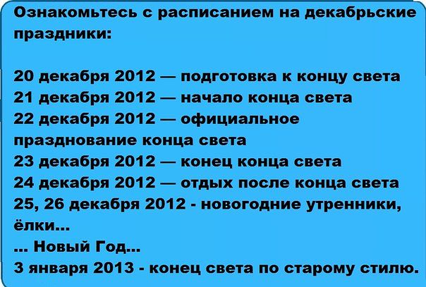 extremal Опубликовано 12 декабря, 2012 Автор Опубликовано 12 декабря, 2012 В связи с приближающимся концом света, предлагаем Вам рассмотреть наше коммерческое предложение и запастись пропитанием - сухими концентратами белков жиров и углеводов – протеинами и гейнерами. Почему именно этими продуктами?: 1) Они пригодны к употреблению без термической обработки, достаточно развести рекомендуемое количество порошка в воде; 2) самый концентрированный источник питательных веществ - 80 г гейнера разведённого с водой заменяют полноценный обед, а всего 30 - 40 г протеинового концентрата заменяют 140-200г куриной грудинки; 3) абсолютно герметичная упаковка – не боится попадания в воду и под кислотный дождь; 4) Спортивное питание (СП) можно употреблять детям (после 7 лет), а также СП можно подкармливать домашних животных. Почему надо покупать протеины и гейнеры именно у нас?: 1) Ингредиенты и сырьё произведены и закуплены осенью 2012 года, а сроки годности конечной продукции максимальны – начало 2014 года; 2) Натуральные ароматизаторы в коктейлях позволят Вам настальгически наслаждаться великолепными вкусами – бананово-ванильным, клубника со сливками, шоколадный крем, карамельная нуга. 3) Мы ввели новые большие экономичные упаковки – Бигбеги весом нетто 1,6 и 3,2 кг. В упаковке есть мерная ложка. После вскрытия пакет закрывается на зип ленту. Материал упаковки – многослойный ПЭТ с фольгой 20мкн, что достаточно для экранирования продукции от гамма узлучения с длиной волны < 5•10?3 нм 4) Только до 21 декабря мы предлагаем дополнительную скидку при покупке даже 1-й единицы продукции – 5%, при покупке 2-х упаковок – 10%, 3-х упаковок – 15%. Ваши личные скидки учитываются, но не суммируются с предложением. 5) Бонус! Каждый покупатель получает в подарок герметично упакованные пробники спортивного питания. При заказе 1-й упаковки – 2а пробника, 2-х упаковок – 3 пробника, 3-х упаковок – 4 пробника. Ознакомиться с ассортиментом спортивного питания EXTREMAL вы можете на сайте Заказ продукции осуществляйте со специальной странички "ZAKAZ" Не забудьте приобрести шейкер для автономного приготовления коктейлей! Предложение действует только до Конца света – 21 декабря. Расписание работы складов со спортивным питанием на декабрьские праздники прилагаем. С уважением и чувством юмора, компания «Экстремал»))