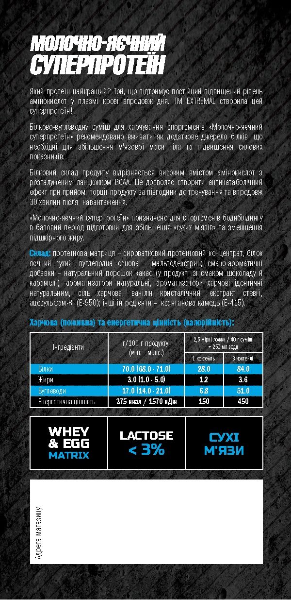 extremal Опубликовано 20 декабря, 2012 Автор Опубликовано 20 декабря, 2012 (изменено) Зачем в составе крахмал и мука?????????? Может чтоб кексики печь? )) Видя такие ингридиенты в составе СРАЗУ отпадает желание брать продукт. Имхо. Так вначале надо задавать вопрос и получить ответ, а потом делать выводы и печь кексики.)) Крахмал и мука добавлены в минимальном количестве и выполняют роль замутнителя. То есть, придают коктейлю белый цвет уменьшая прозрачность. Так красивее.)) Теперь Вы понимаете что это чисто "техническая" добавка, не предназначенная для выполнения какой либо другой функции. Родилось решение в процессе штудирования состава мировых гейнеров и экспериментов с ингредиентами. И я всегда думал, что гейнер - это УГЛЕВОДНО-белковая смесь, а не Белково-углеводная. Хотя может это не имеет значения. СБВК или Смеси белково-углеводные для коктейлей, это общее название всей нашей продукции производимой согласно ТУ У 15.8 - 31455167.001-2001 (изменение 2). Под этими ТУ выпускаются Протеиновые смеси, протеины и гейнеры. Также мы выпускаем некоторую часть продукции используя ТУ У 15.8: 31455167.002-2006 (изменение 2) Это ДДПСФ - Добавки диетические для питания спортсменов фасованные - креатин, глютамин, карнитин, ВСАА и другое. Изменено 20 декабря, 2012 пользователем extremal