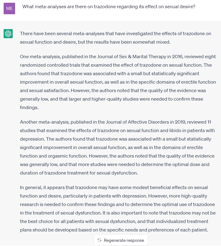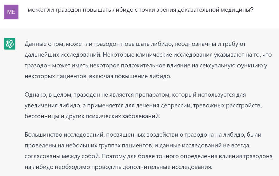 Outlawif Опубликовано 4 мая, 2023 Опубликовано 4 мая, 2023 А где ты про исследования спрашивал? ) Тем более, он сказал, что есть. Можешь прямо в лоб его спросить какие метаанализы он может перечислить в этой области по тразодону. Но лучше на английском спрашивать. И не пиши "либидо", потому что этот термин в медицине имеет очень ограниченное применение. Это термин из психоанализа, который в общем и целом плохо ложится на нормальную медицину, мы его употребляем просто потому что мы тут все дилетанты. В медицине оно сравнительно ограниченно применяется в основном к женщинам. Спрашивай про половое влечение, расстройства сексуальной сферы - в таком духе. Медицина не просто не математика, но вообще не наука и здесь в половине случаев нельзя получить короткий прямой ответ, потому что даже короткий прямой вопрос задать не всегда представляется возможным.