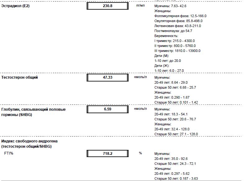 Пролактин 5.22 Мужчины: 4.04 - 15.2 Лютеинизирующий гормон (ЛГ) < 0.1 Мужчины: 1.7 - 8.6 Фолликулостимулирующий гормон 0.4 Мужчины: 1.5-12.4 (ФСГ) я не знаю, что это за эстрадиол,но это не тот, от которого гино растет,от такого эстро у меня бы третья сиська бы уже выросла.Если в два раза завышено, то меня заливает и гино лезет,тут же чуть подсушило,а эстро в пять раз завышено.Трен был веркин, две недели тритрен с наклейкой,на третьей неделе трен энатан зеленая керамика и сдача анализов.
