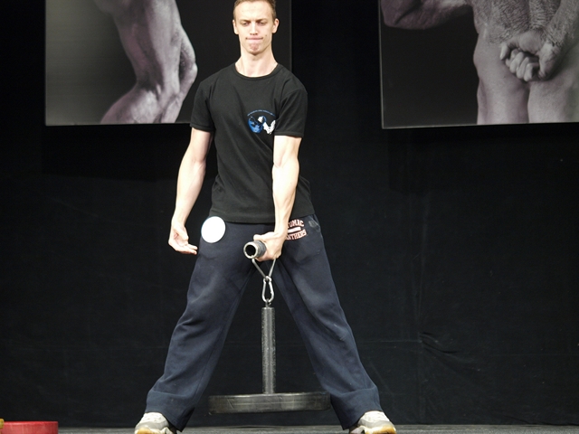 31 reps CoC#3 20 mm block set; 12 reps CoC#3.5 20 mm block set; T9 (Tetting Grand Elite) 4 reps 20 mm block set - both hands; Little Big Horn on contest - 111.2 kg; on training - 136 kg ; Inch hold 64 sec; FBBC 3'' dumbbell handle - 95.8 kg=211 lbs CoC#4 4 reps 20 mm block set right hand & 10 reps MMS. GHP certification Level 9 - 2 reps - 3rd place. Official World Record on axle Ironmind double overhand deadlift - 236.1 kg ; Double Inch Dumbbells walk - 40.3 m - 132 feets. Millennium Dumbbell 40 singles both hands for 1 hour, 6 reps right hand strict |