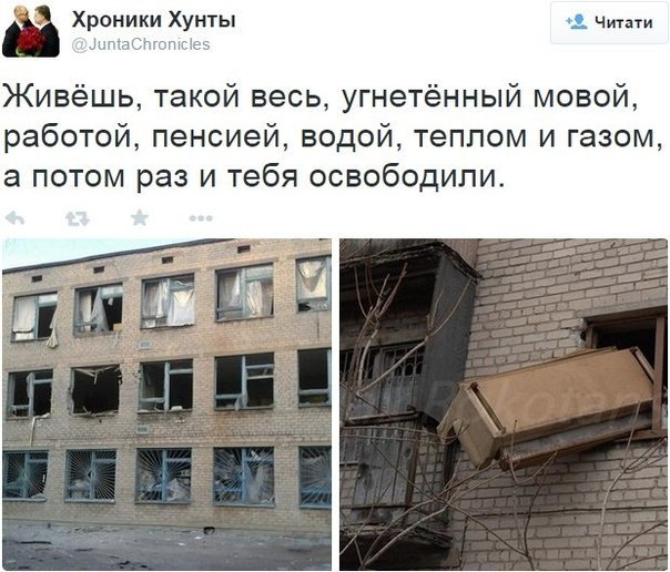 Интересный был у нас был разговор с моим знакомым особенно для адептов "русского мира" жаль что они не слышали.Собрались два двухметровых дяди лет за сорок,оба этнические русские и обсудив жизнь пришли мы к такому выводу: 1.Если все пойдет совсем плохо то бежать некуда,так как все наши корни здесь. 2.Жить в оккупации тоже не сможем так как "перековке" не подлежим и за наши действия и взгляды нам любой имперский прокурор выпишет долгосрочную путевку в тайгу. 3.Поэтому если "освободители" подойдут близко,то не смотря на болячки выход только один идти отбиваться от "сакральных благодетелей". 4.Вопрос к господину Путину-Зачем нас таких темных и неблагодарных пытаться вернуть обратно в Империю? Может и не стоит..хлопотно это.. -------------------- Нам не страшні московські воші, нам страшні українські гниди (с) С.Петлюра