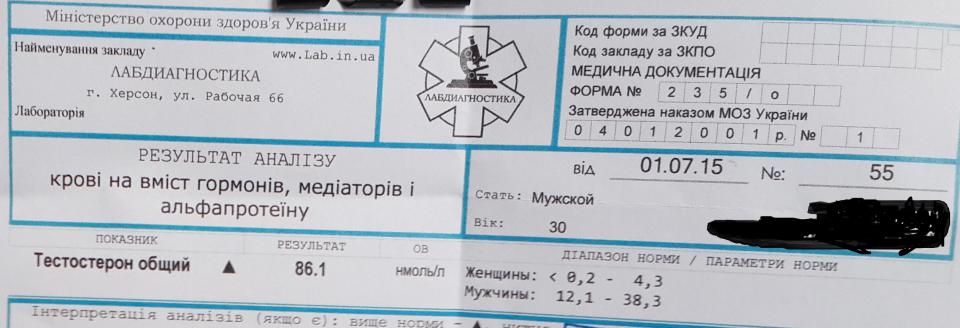 Вот и мой анализ Суста ЖЖ. Ставилось по 0,5 куба (125 мг) раз в три дня, было сделано 7 инъекций. Анализ сдан примерно через 24 часа после последнего укола: